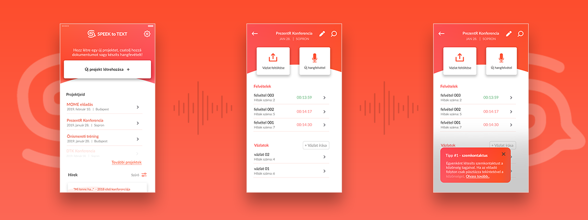 A kurzus során egy kommunikációs készségeket fejlesztő applikáció megtervezésén dolgoztunk. Az alkalmazás egy olyan algoritmus köré épül, amely képes egy hangfelvételt szöveggé alakítani és különböző beszédtechnikai szempontok szerint elemezni, hibákat keresni benne. Kutatásunk során felmértük a célközönséget, és interjúk által igyekeztünk minél szélesebb körben feltárni azokat a problémás területeket, melyekre az algoritmus megoldást tud nyújtani. Az applikációval rögzíthetjük és elemezhetjük saját előadásainkat. A vizsgálatok fő szempontjai a megfelelő beszédtempó és hangerő, szóismétlések és töltelékszavak használata, a megadott időkorlát betartása. Az eredmények összehasonlításával mérhetővé válik prezentációs készségeink fejlődésének folyamata.